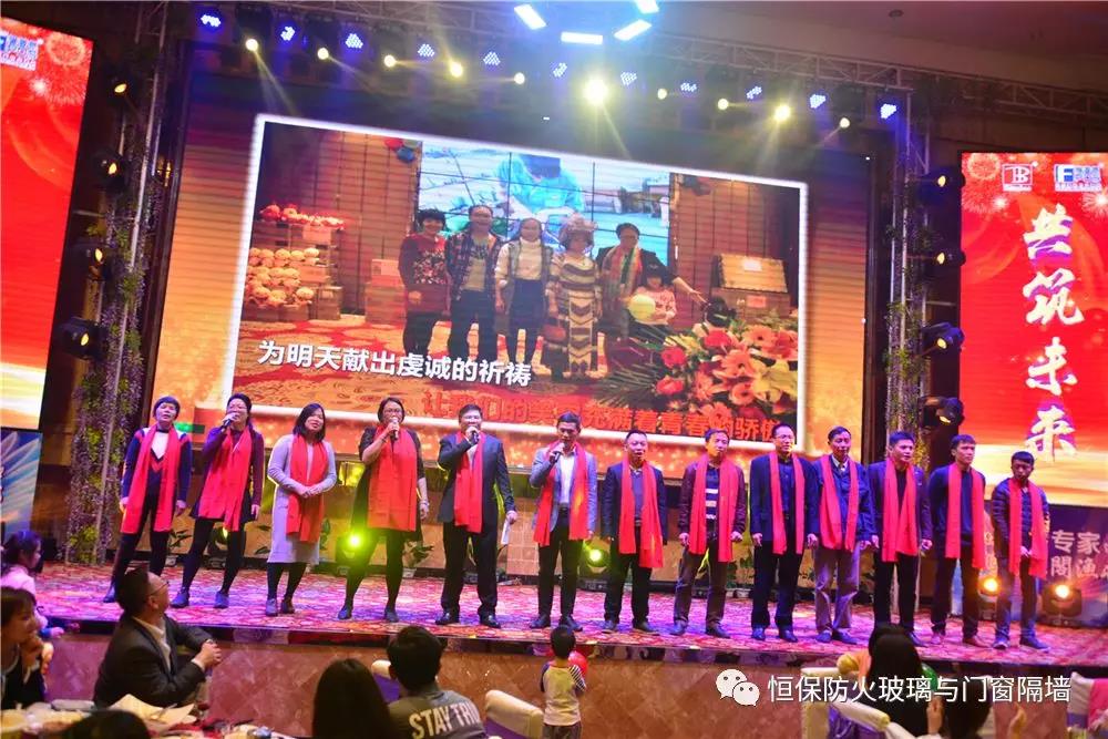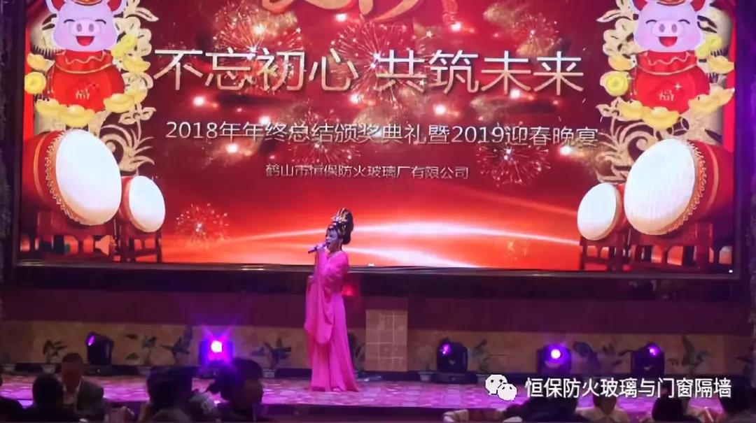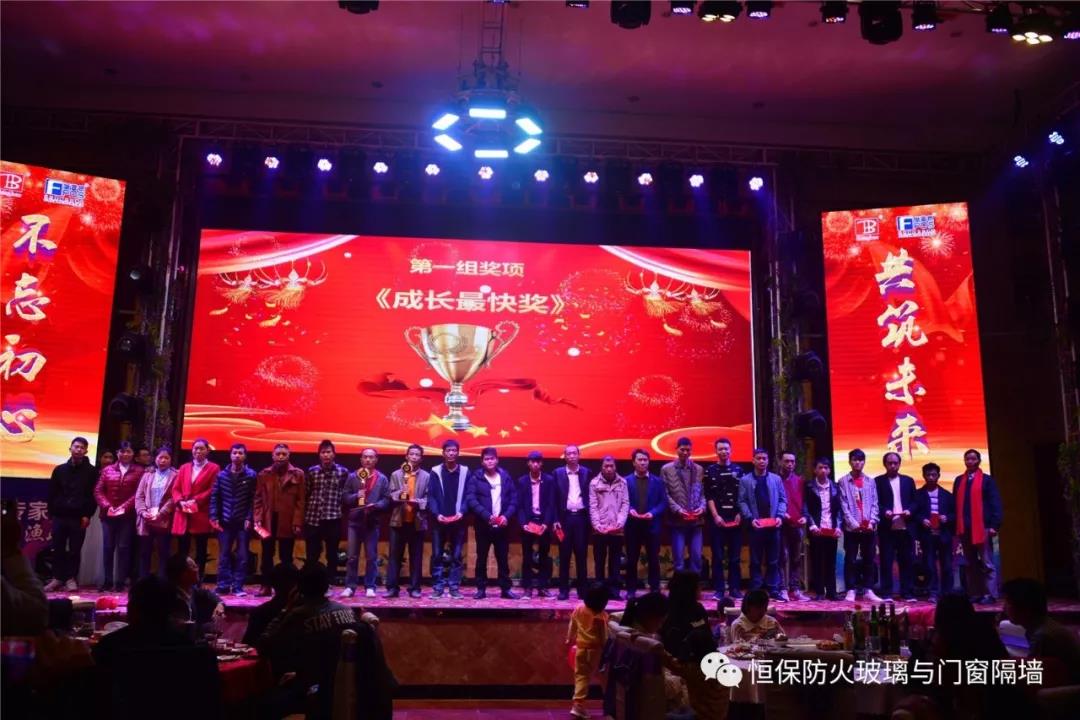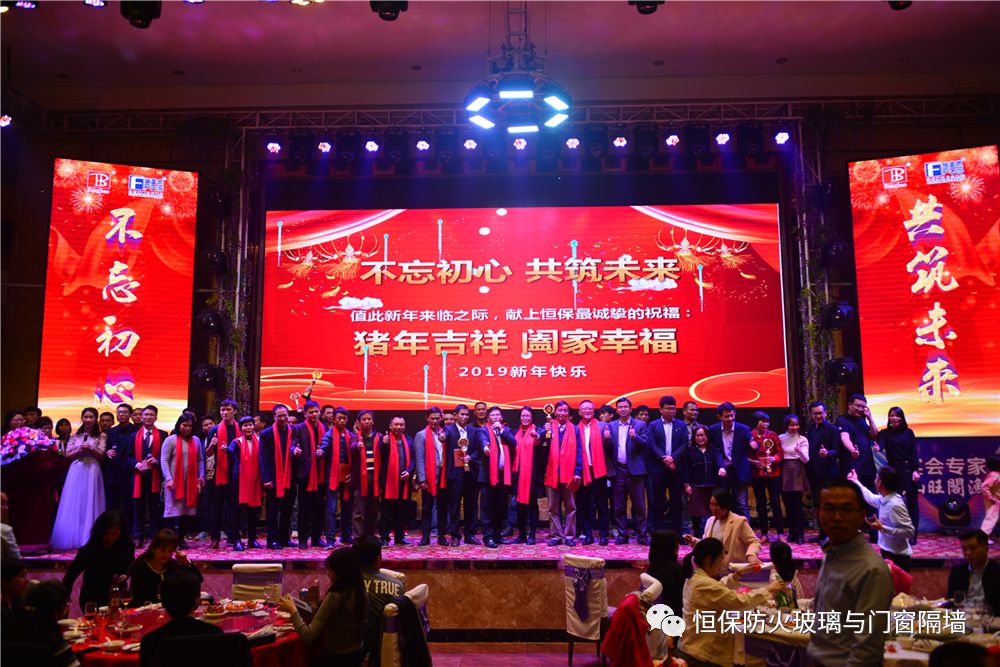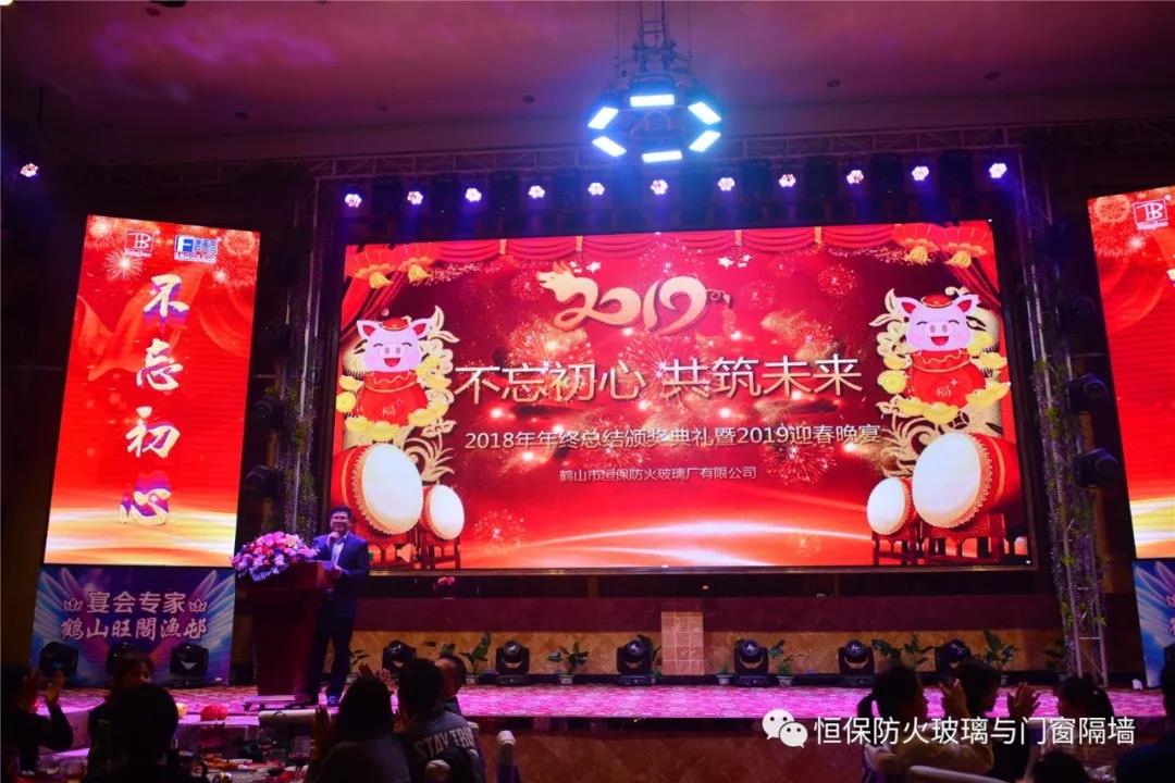 19:30分,恒保年會在鼓舞飛揚中拉開了帷幕,首先是恒保總經理陳沃林先生做年終致辭,陳總回顧了2018年所取得的成績與不足,并提出了2019年恒保要全力以赴,不忘初心,繼續奮斗,再創佳績的戰略方針。2018年是恒保跨越發展的一年。全體恒保家人,團結一心,艱苦奮斗,全力實現了公司既定的年度目標,同比各項重要指標增長逾80%2018年我們大力引進新設備,開發新產品10多項,產品通過國家檢測20多項 ,至此,恒保出品已擁有373C認證,158份檢驗報告,成為行業內公認通過國家檢驗、認證最多的防火玻璃門窗企業;2018年在行業各類權威獎項評比中,榮獲“全國鋁門窗幕墻展 年度星品獎”、榮獲“新玻網 門窗玻璃十強企業”、陳沃林總經理榮獲鶴山市工商聯系統“工匠之星”稱號、陳沃林總經理榮獲第五屆中國玻璃行業“玻璃工匠”稱號、榮獲第三屆建筑門窗金軒獎“最具創新力配套產品”、榮獲第三屆建筑門窗金軒獎“最具發展潛力企業”、榮獲中國門窗幕墻行業“科技進步推動獎”等十多項獎項。2019年我們將持續優化各部門管理,提高員工工作技能、提高生產管理水平、提高生產效率、提高綜合管理能力,減少物料損耗,減少出錯率。加強精密型材、新型防火門窗的開發,滿足不同客戶的需求。2019年恒保上下一心、同心協力、不忘初心,共筑未來,為實現中國平安夢、世界平安夢繼續奮斗!