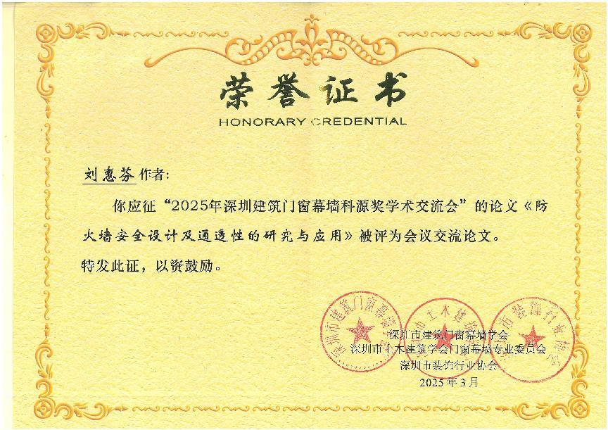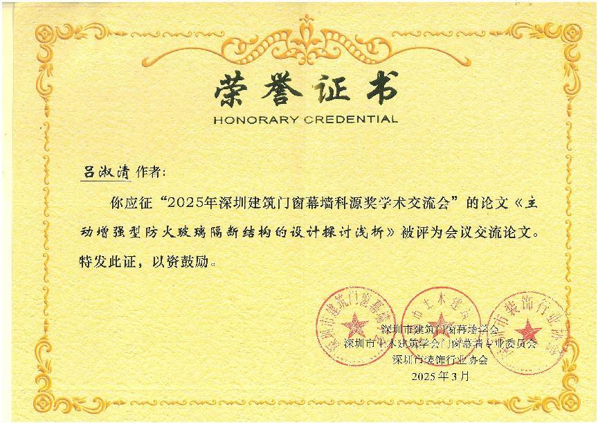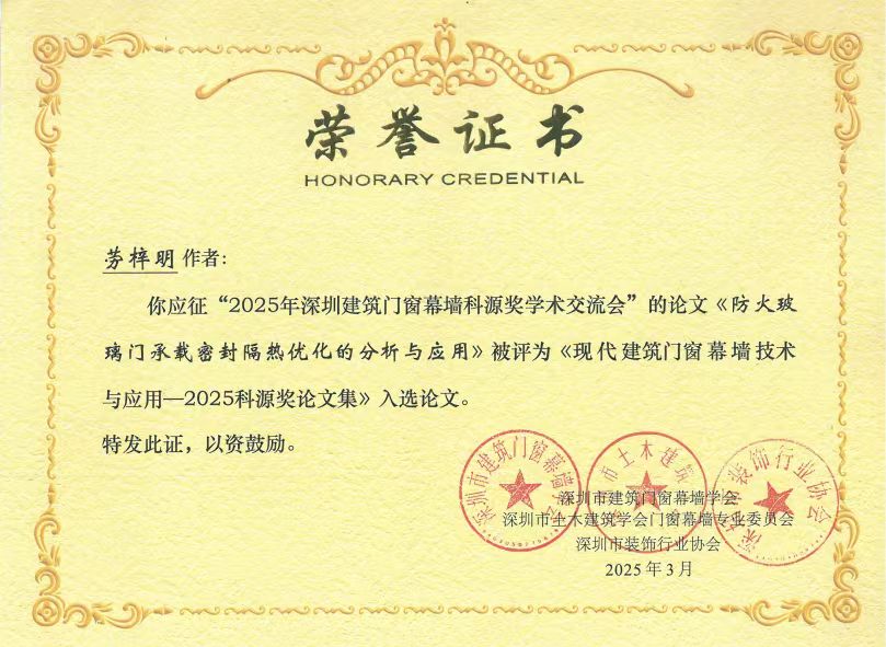 在2025科源獎(jiǎng)獲獎(jiǎng)學(xué)術(shù)論文及學(xué)術(shù)交流先進(jìn)單位頒獎(jiǎng)儀式中,恒保公司共3篇論文榮獲學(xué)會(huì)表彰,其中工程師勞梓明撰寫(xiě)的《防火玻璃門承載密封隔熱優(yōu)化的分析和應(yīng)用》被評(píng)為《現(xiàn)代建筑門窗幕墻技術(shù)與應(yīng)用——2025科源獎(jiǎng)?wù)撐募啡脒x論文!
